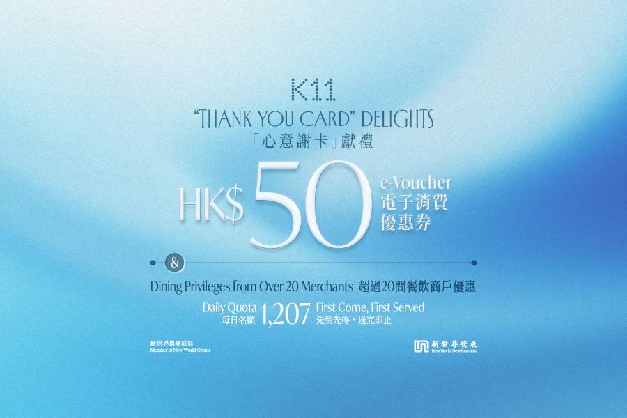 今次集团推出的消费礼遇为期一个月,由今年12月7日投票日起至明年1月8日,市民只要手持"心意谢卡",即可在K11 MUSEA 或 K11 Art Mall 的地下礼宾部,换领价值港币50元的电子消费优惠券,并于今年12月7日至明年1月22日,可在场内超过300间指定商户使用,凡单一消费净值满港币100元或以上即可享港币50元折扣优惠,亦可享超过20间餐饮商户的额外优惠。